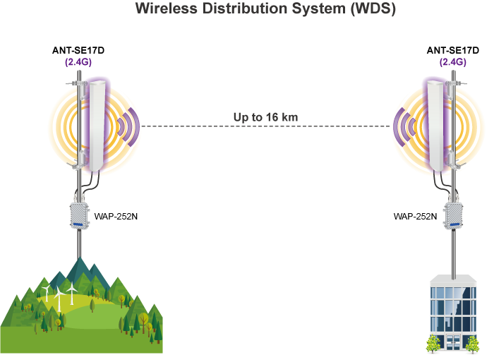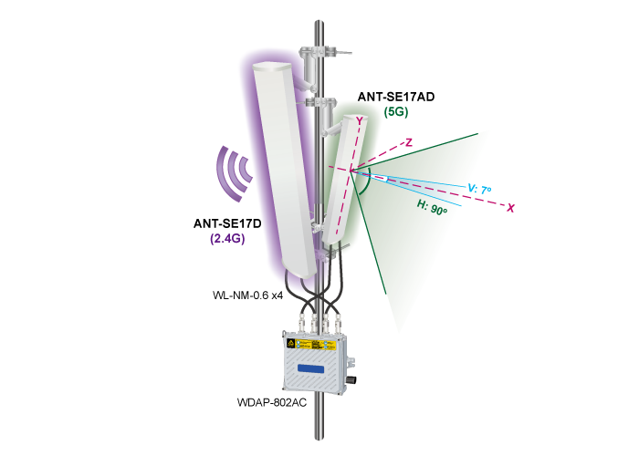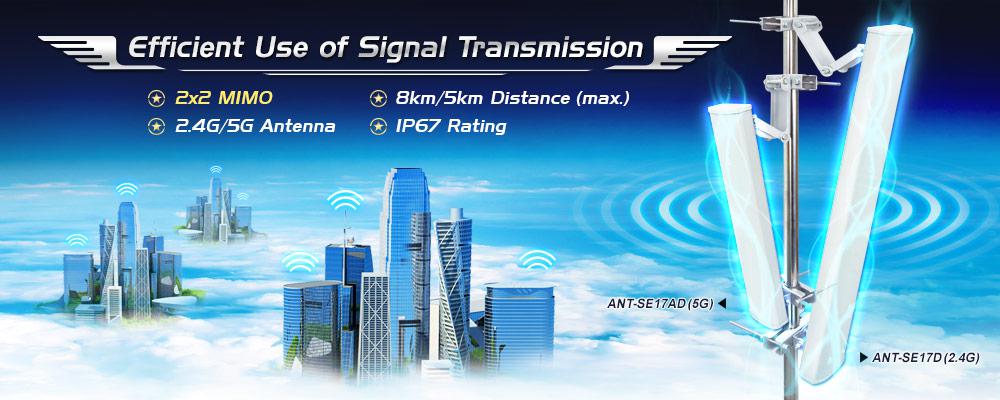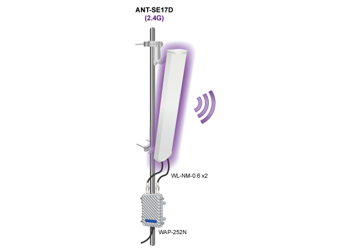 Поскольку ANT-SE17D может эффективно повысить производительность и покрытие среды 802.11n 2,4 ГГц, он также вполне подходит для приложений наружных беспроводных локальных сетей, таких как двухточечное соединение между складами.