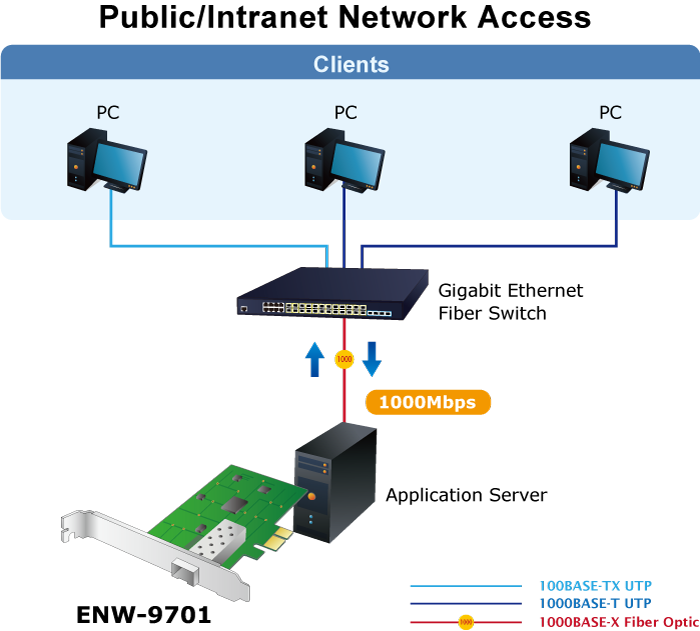 PLANET ENW-9701 оснащен слотом SFP, который позволяет пользователям без каких-либо ограничений увеличивать дистанцию связи и обеспечивает производительность до десяти десять раз больше, чем существующая технология передачи Fast Ethernet. ENW-9701 может легко выступать в качестве серверной сетевой карты вашей сети, для подключения к магистральным коммутаторам, а также подходит для материнской платы с PCI Express сейчас и в будущем. ENW-9701 — это экономически эффективное решение и лучший выбор для модернизации различных приложений оптоволоконной сети, таких как:
