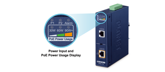 IPOE-176 оснащен интуитивно понятной светодиодной индикацией для мониторинга состояния PoE и потребления энергии в реальном времени. В режиме Legacy загорается светодиод Legacy, указывающий на поддержку устройств с нестандартным питанием, а режим Force Mode можно использовать, если подключенное устройство PD не может быть включено в режиме Legacy. Кроме того, три янтарных светодиода PoE Power Usage на передней панели отображают текущее состояние нагрузки PoE в зависимости от выходной мощности, представляя уровни 30 Вт, 60 Вт и 90 Вт, постоянно или мигая, что позволяет пользователям быстро проверять состояние питания PoE подключенного устройства.
