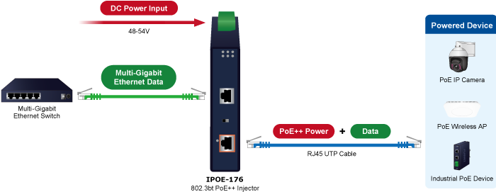 Обратная совместимость со стандартами PoE IEEE 802.3af/at/bt позволяет IPOE-176 гибко развертывать как стандартные, так и мощные устройства, передавая данные и питание по одному кабелю Ethernet на расстояние до 100 метров. Устраняя необходимость в дополнительных розетках переменного тока в месте установки устройства, IPOE-176 упрощает развертывание сети для промышленных беспроводных точек доступа, систем IP-видеонаблюдения и периферийных устройств, снижает сложность кабельной разводки и значительно сокращает время установки в сложных или труднодоступных условиях.