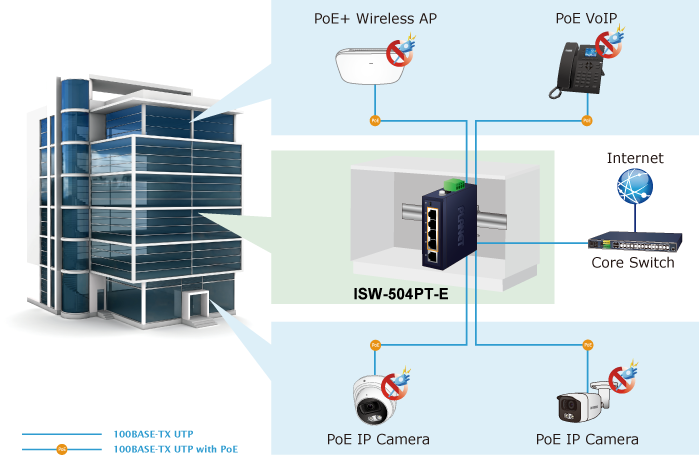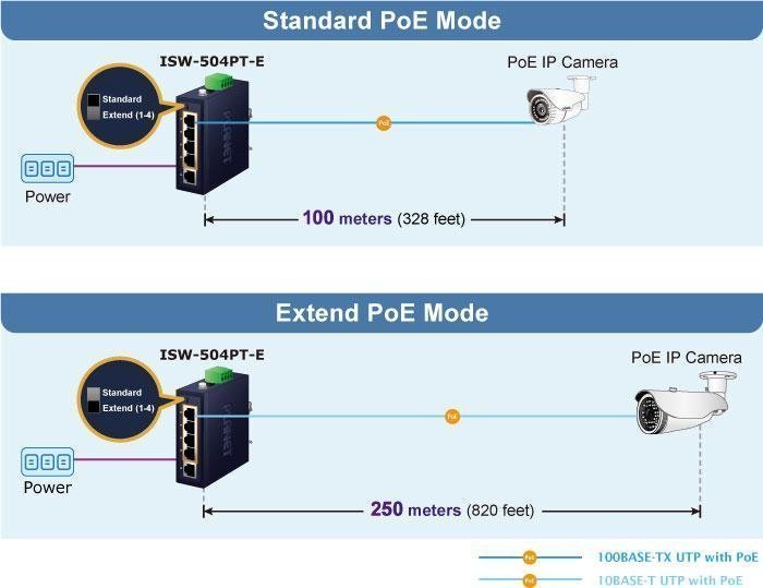 Встроенный DIP-переключатель обеспечивает режимы работы «Standard» и «Extend». В режиме «Standard» ISW-504PT-E работает как обычный коммутатор PoE IEEE 802.3at/af. В режиме «Extend» ISW-504PT-E работает попортово в дуплексном режиме 10 Мбит/с, но может поддерживать выходную мощность PoE 30 Вт на расстояние до 250 метров, что превышает 100-метровый лимит для кабеля Ethernet UTP. Благодаря этой новой функции ISW-504PT-E предоставляет дополнительное решение для увеличения расстояния PoE 802.3at/af, что позволяет сэкономить на прокладке кабеля Ethernet.