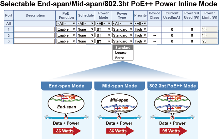 | PoE Power Supply Mode | 802.3bt End-span Mid-span |