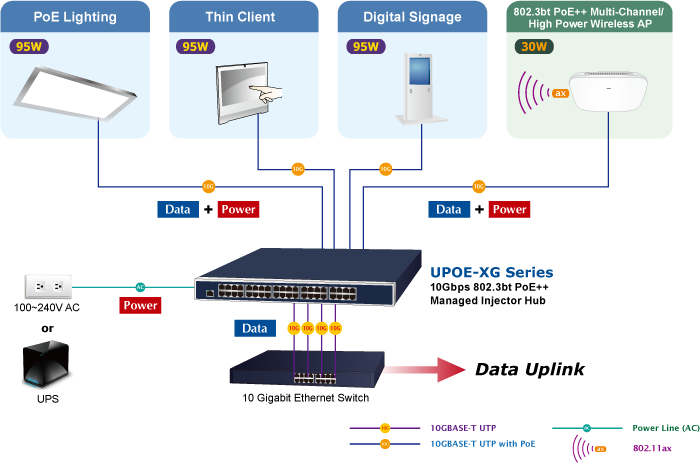 Благодаря использованию технологии стандарта IEEE 802.bt PoE++, UPOE-1600XG способен обеспечивать мощность до 95 Вт, используя все четыре пары стандартных кабелей Ethernet Cat.5/5e/6/7 для подачи питания и передачи данных на полной скорости каждому удаленному устройству с поддержкой PoE (PD). Его мощность в три раза превышает мощность обычного 802.3at PoE+, что делает его идеальным решением для сетевых устройств с высоким энергопотреблением, таких как:
