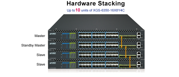 До 10 устройств XGS-6350-16X8Y4C можно объединить в стек для работы в качестве единого логического коммутатора, что упрощает управление сетью и ее расширение. Кольцевая архитектура стекирования обеспечивает резервирование, благодаря чему передача данных продолжается даже при отказе одного из устройств. Коммутаторы также можно заменять без прерывания работы, что значительно упрощает модернизацию и масштабирование при растущих потребностях в пропускной способности.