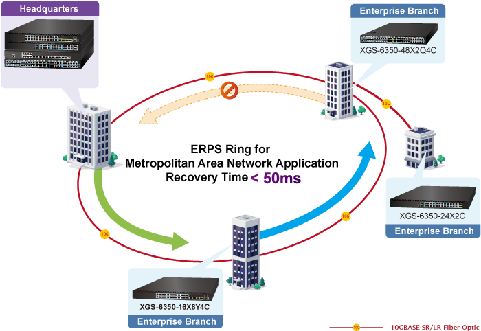 XGS-6350-16X8Y4C поддерживает технологию резервирования кольцевой сети и обладает высокой, быстрой способностью к самовосстановлению, предотвращая сбои и внешние вторжения. В его состав входят передовые технологии ITU-T G.8032 ERPS (Ethernet Ring Protection Switching) и протокол Spanning Tree Protocol (802.1s MSTP), что повышает надежность и время безотказной работы системы в сложных условиях. В некоторых простых кольцевых сетях время восстановления может составлять менее 50 мс, что позволяет быстро вернуть сеть в нормальное рабочее состояние.