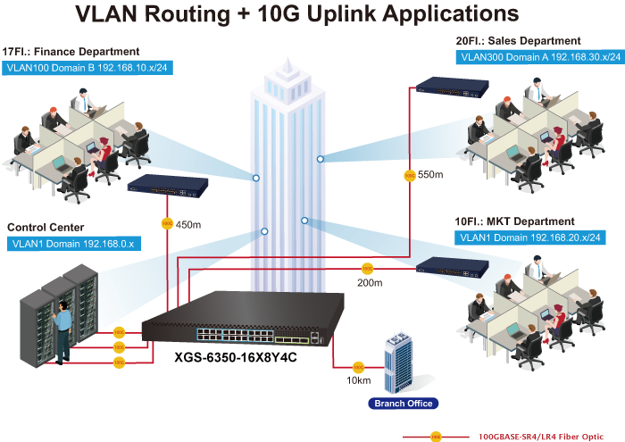 Благодаря встроенным возможностям маршрутизации уровня 3, серия XGS-6350 обеспечивает надежную маршрутизацию между VLAN и подсетями. Протоколы маршрутизации могут применяться на интерфейсах VLAN, поддерживая до 32 000 аппаратных маршрутных записей. Являясь идеальным решением для корпоративных сетей, серия XGS-6350 обеспечивает повышенную безопасность, улучшенное управление трафиком, оптимизированное использование полосы пропускания и высокоскоростное восходящее соединение 100G.