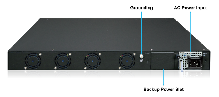 Модель XGS-6350-16X8Y4C оснащена одним извлекаемым модулем переменного тока 100–240 В, что упрощает замену источника питания для пользователей. Кроме того, на задней панели XGS-6350-16X8Y4C предусмотрен еще один слот для резервирования питания, позволяющий пользователям добавить второй модуль для переменного или постоянного тока, создавая резервированный блок питания. Пользователь может выбирать источник переменного или постоянного тока. Резервируеая система электропитания специально разработана для высокотехнологичных объектов, требующих высочайшей надежности электроснабжения
